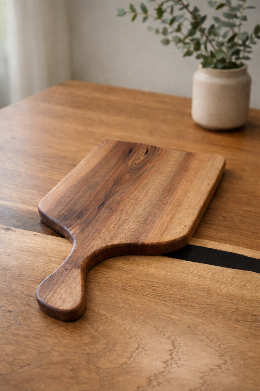 Apportez élégance et convivialité à vos moments de partage avec cette planche à apéro en noyer massif, fabriquée artisanalement dans mon atelier. Le noyer est un bois noble, apprécié pour ses teintes chaleureuses et son veinage unique, faisant de chaque planche une pièce différente.